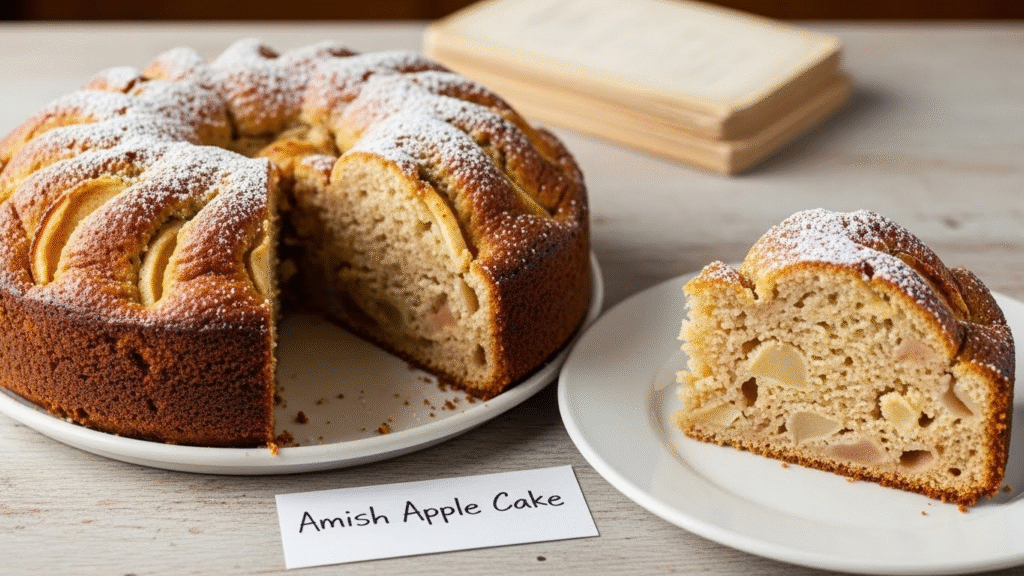 Amish recipes focus on plain ingredients. This cake bakes in one pan. It stays moist for days. Users often ask about history. Amish baking comes from farm life with apples in season.