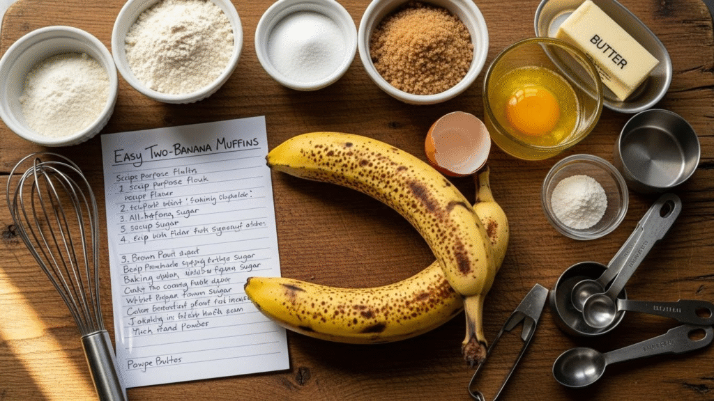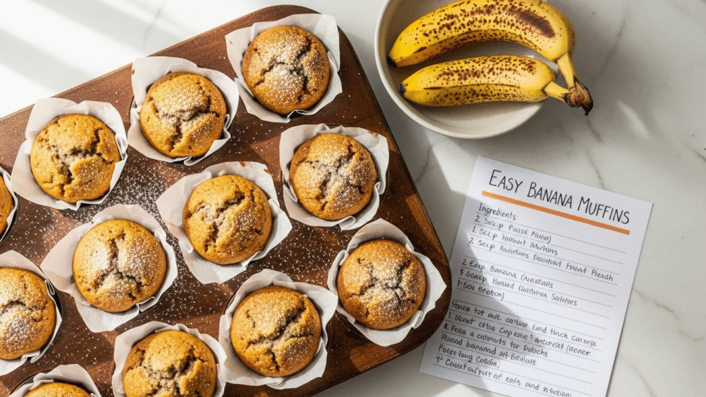 Banana muffins are soft, moist, and comforting. This recipe uses two ripe bananas, which makes it ideal when you do not have a full bunch on hand. Ripe bananas add natural sweetness and help keep the muffins tender. The ingredients are basic, and the steps are easy to follow.