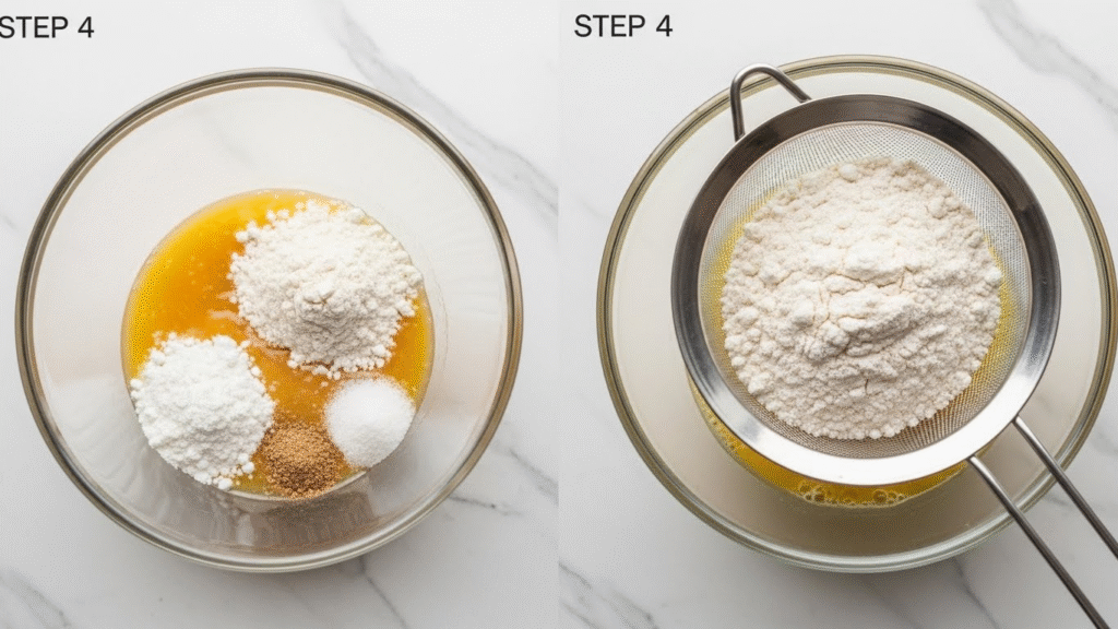 - In a separate bowl, combine flour, baking powder, baking soda, and salt.
