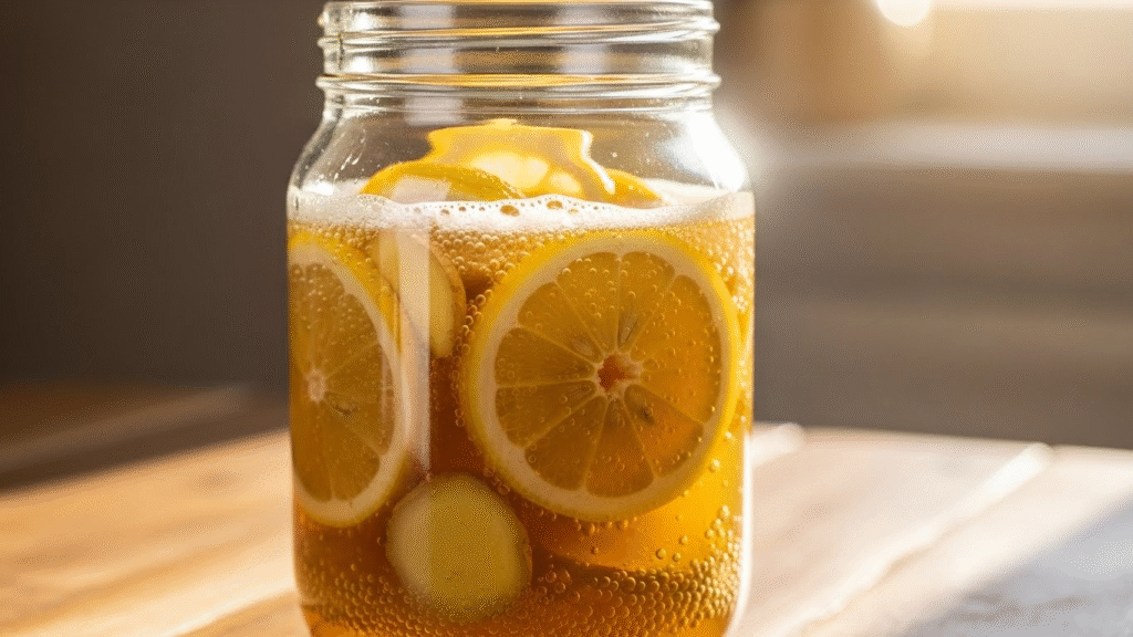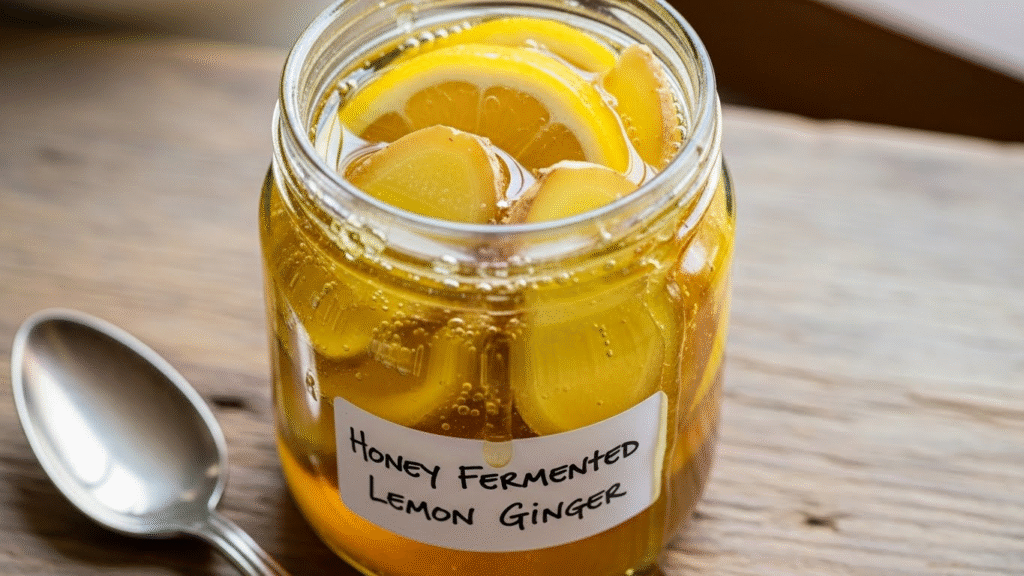 This recipe uses raw honey to ferment lemon and ginger. It creates a tangy syrup. People make it for gut support and cold relief. Research shows it may help digestion and boost immunity. Results vary by person.
