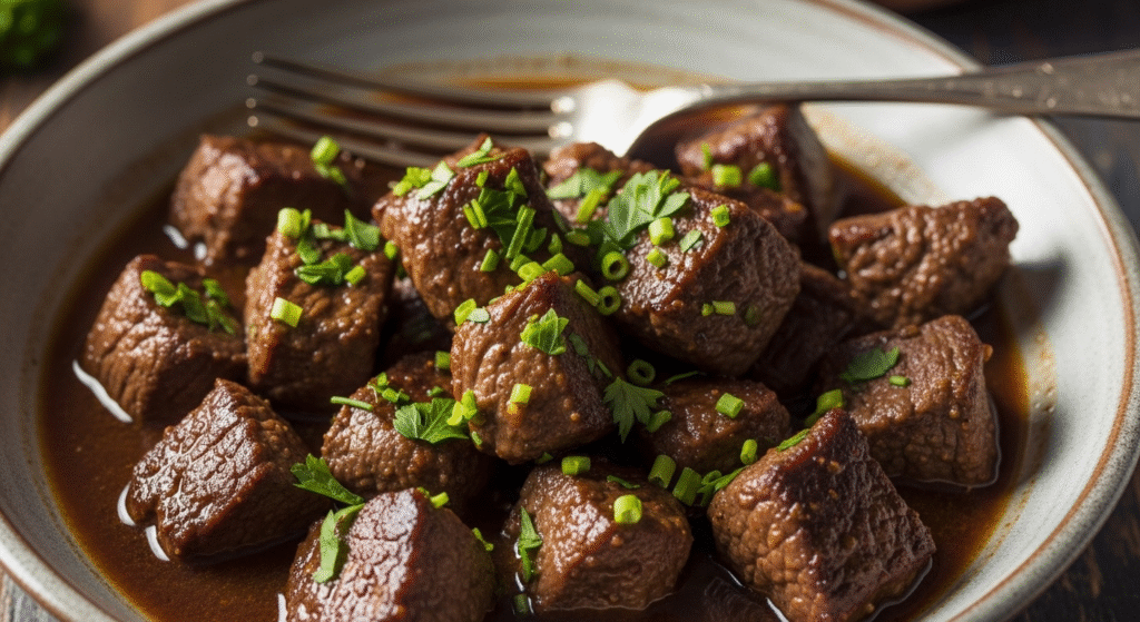This recipe makes tender steak bites in a savory gravy. It uses basic ingredients. You get juicy meat that falls apart. Serve it over mashed potatoes or rice for a full meal.